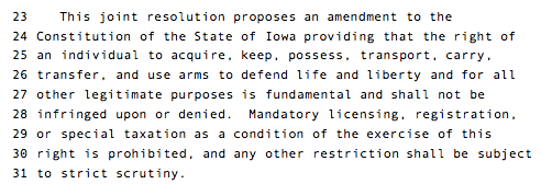 Iowans already have the right to bear arms, but Republicans just want to make extra, super, positively sure. They hope to get an official Iowa constitutional amendment reaffirming the right. This would have to be passed through multiple legislative sessions before it gets on the ballot for a vote. The gun lobby believes this will help strengthen their hand in pushing other gun legislation. The real underlying reason, however, is to help boost Republican turnout when it’s on the statewide ballot.