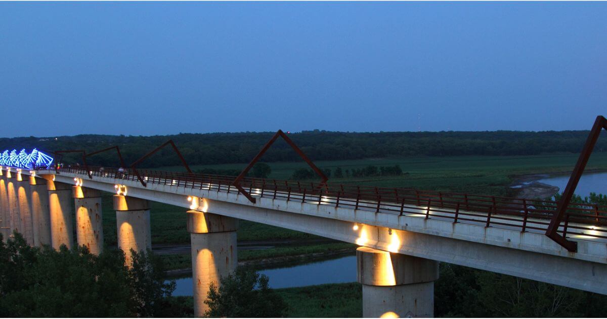 Built in collaboration between Council Bluffs, Omaha, the Iowa DOT, and Nebraska DOT, it is 3,000 feet long, cable-stayed, and a beautiful s-curve. It’s also the first pedestrian bridge built between two states!