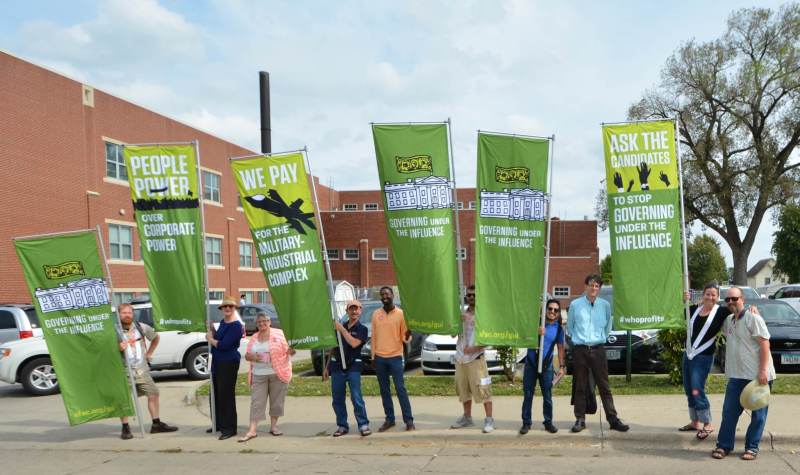 The American Friends Service Committee’s Governing Under the Influence (GUI) project has a mission leading up to the 2016 presidential elections of shining a spotlight and changing the narrative on the excessive political influence of powerful corporations. AFSC is a Quaker non-profit and non-partisan organization dedicated to peace and social justice. Since October 2014, GUI has influenced the national conversation by training citizen volunteers in Iowa and New Hampshire to ask challenging questions of all presidential candidates about #whoprofits from corporations driving war and incarceration policies. Our questions include Pentagon contractors and the military-industrial complex, the $1 trillion nuclear weapons plan, private prisons, immigrant detention and the daily 34,000 immigrant detention quota, and the militarization of police. We educate the candidates, the media, and the audience by asking questions to all the candidates and posting video responses of our interactions on our website gui.afsc.org for more people to see.