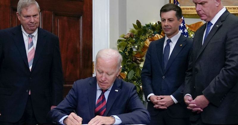 President Joe Biden signs H.J.Res.100, a bill that aims to avert a freight rail strike, in the Roosevelt Room at the White House, Friday, Dec. 2, 2022, in Washington. Biden is joined by from left, Agriculture Secretary Tom Vilsack, Transportation, Secretary Pete Buttigiegand Secretary of Labor Marty Walsh. (AP Photo/Manuel Balce Ceneta)