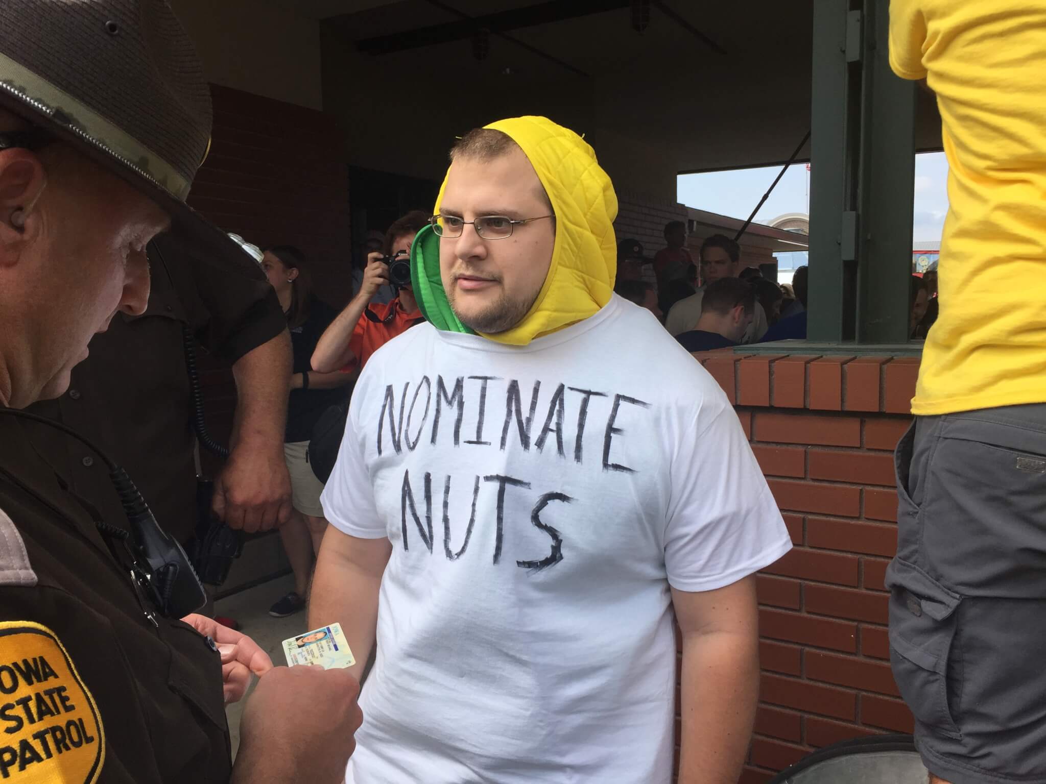 Independent/fake candidate Deez Nuts has been rising in the polls since PPP Polling began adding him into their surveys for fun. It turns out it’s actually a 15-year-old Iowa teenager who filed “Deez Nuts” with the FEC, but that didn’t stop Nuts-mania from reaching the State Fair. A man dressed in a corn cob costume and wearing a shirt that read “Nominate Nuts” approached Chris Christie after his speech. “Mr. Christie, are you intimidated by Deez Nuts?” he asked the Governor. Sadly, Christie did not address the electoral viability of candidate Nuts.