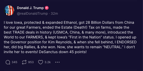 “I opened up the Governor position for Kim Reynolds, & when she fell behind, I ENDORSED her, did big Rallies, & she won,” he continued. “Now, she wants to remain ‘NEUTRAL.’ I don’t invite her to events! DeSanctus down 45 points!”