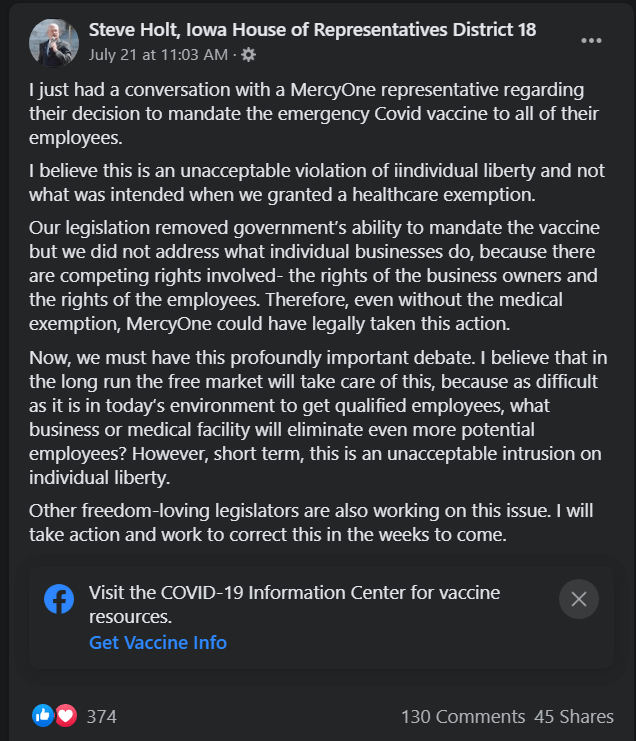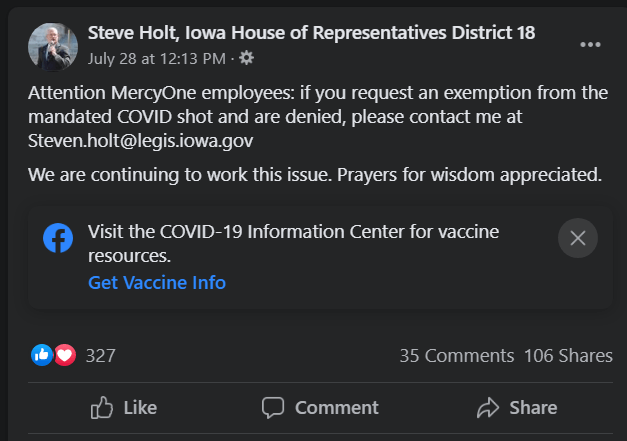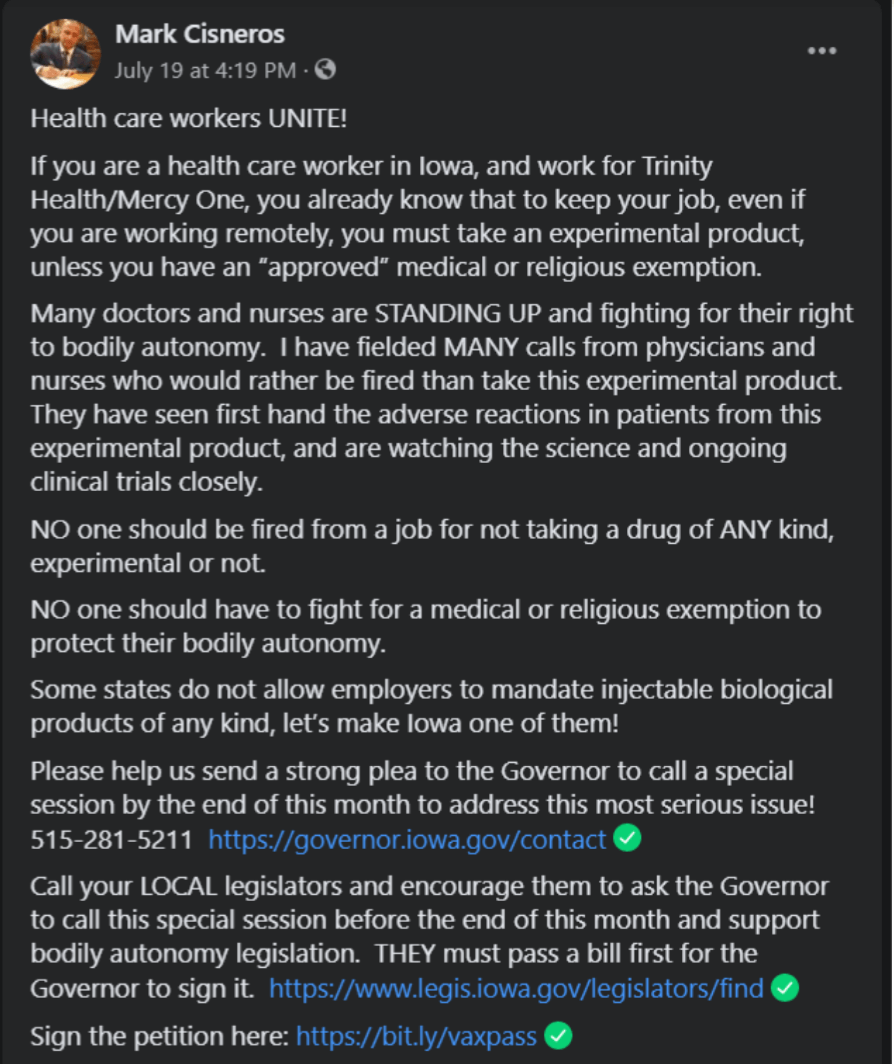 Another legislator, Rep. Mark Cisneros, has shared Facebook posts from Iowans for Informed Consent, an anti-vaccine group, advocating for legislation that would allow health care workers to remain unvaccinated.