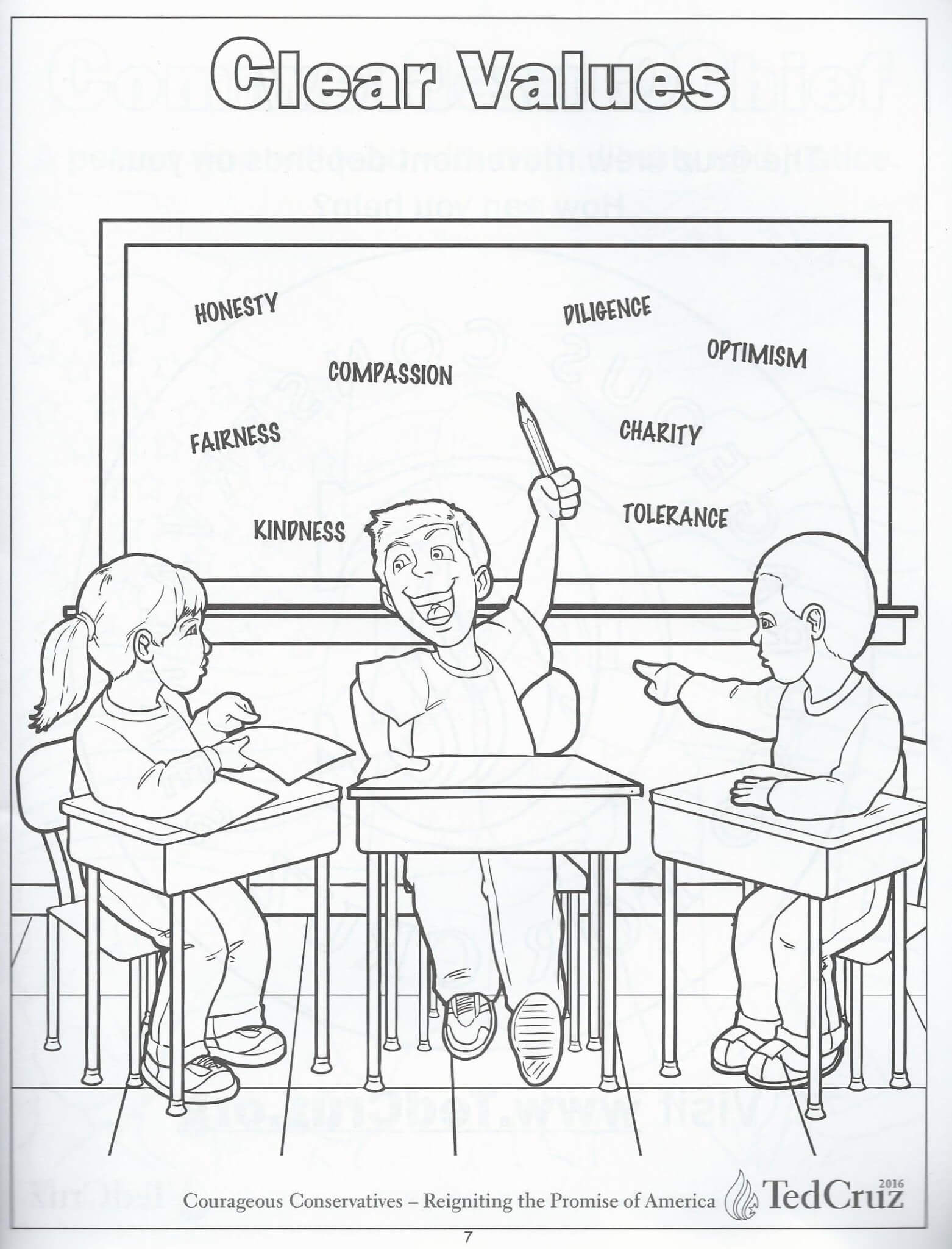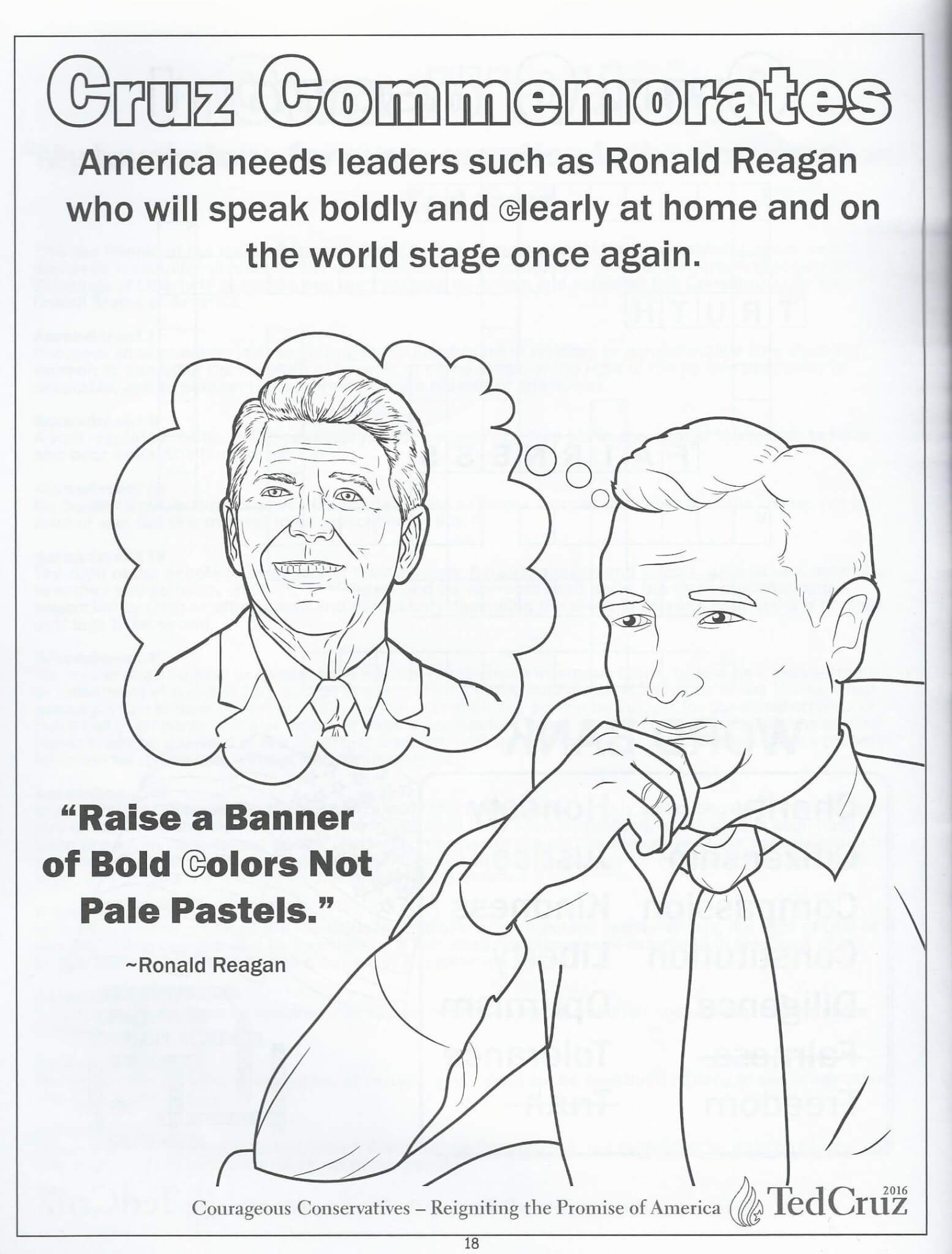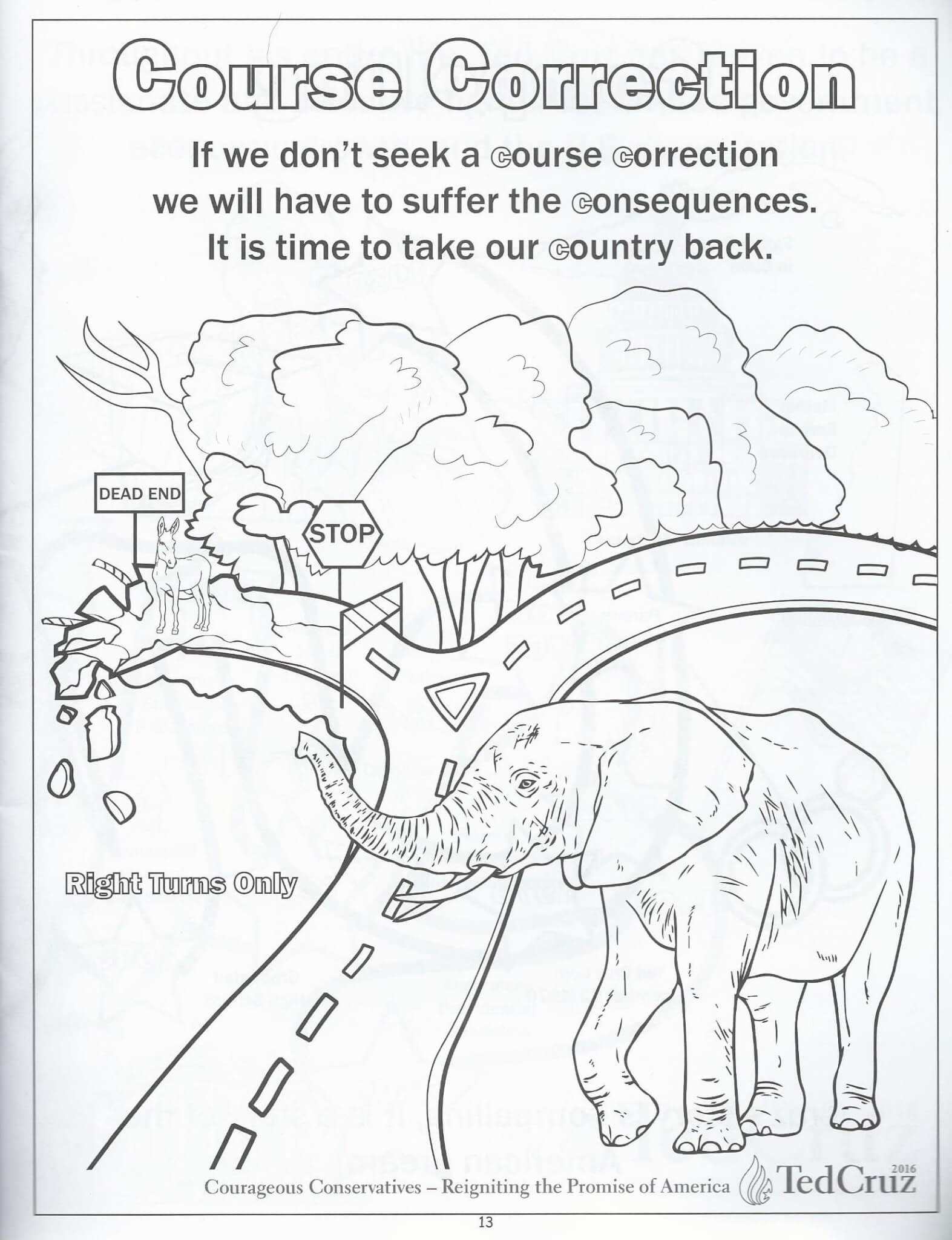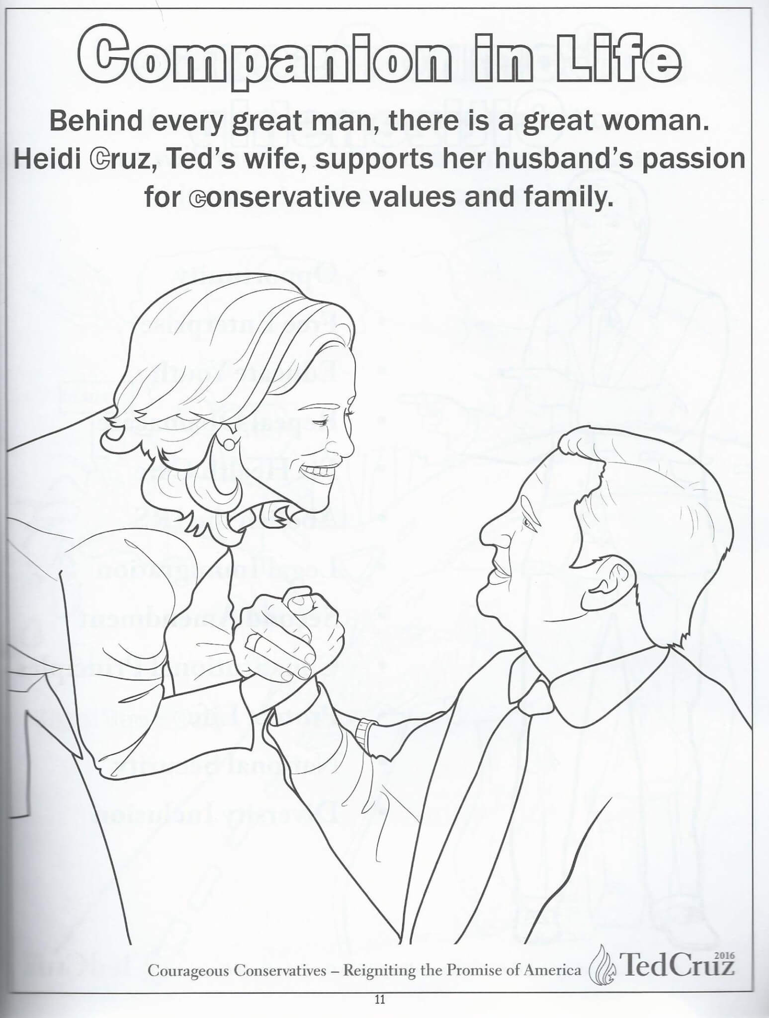 But the coloring book itself? Boy, it’s something else. 30 pages in length and produced by a professional children’s coloring book company, one can only imagine how much money they spent on this. The pictures themselves are, uh, pretty interesting. So let’s take a look at some of the best pages in the Cruz campaign’s coloring book and have some fun adding a little commentary of our own to the illustrations.