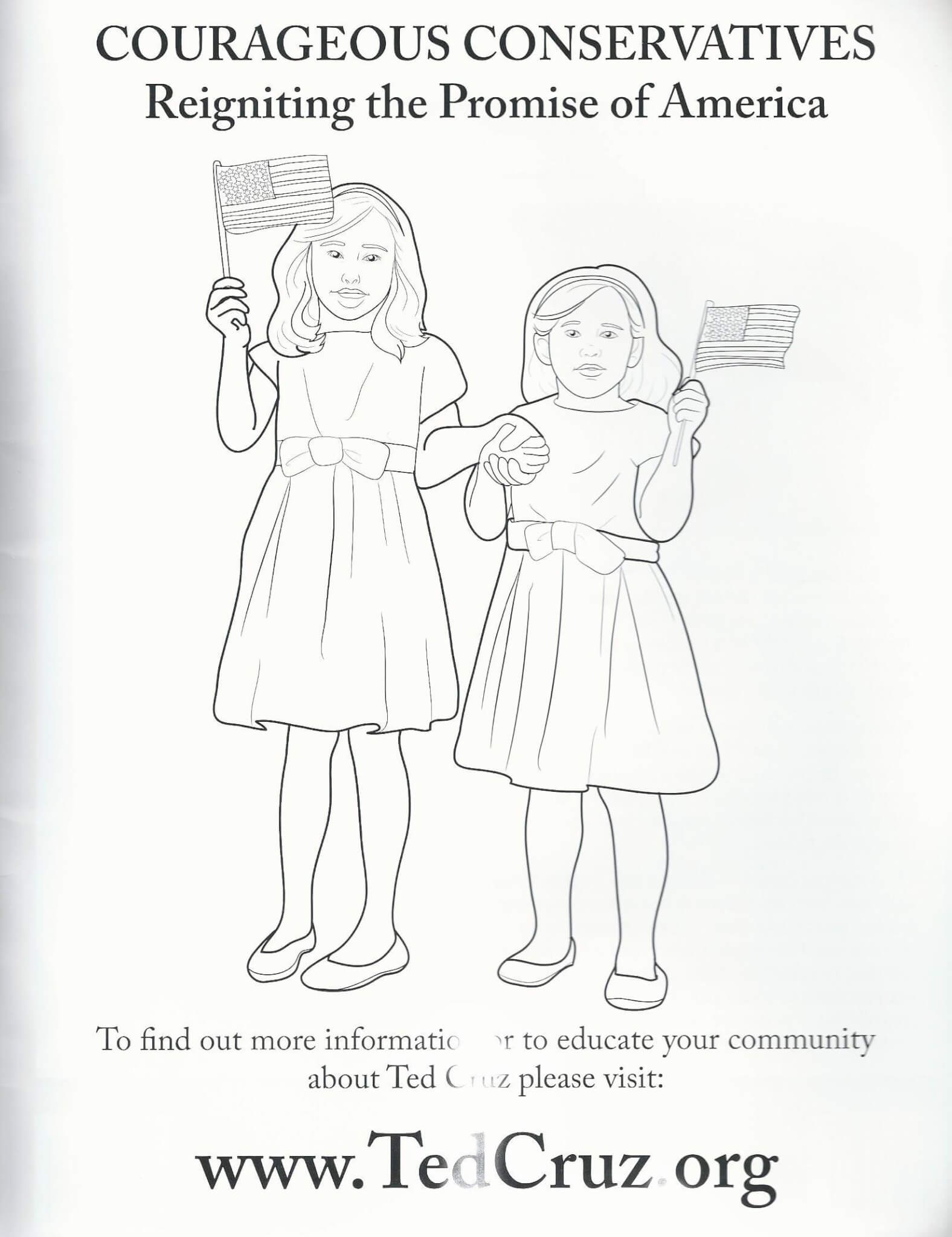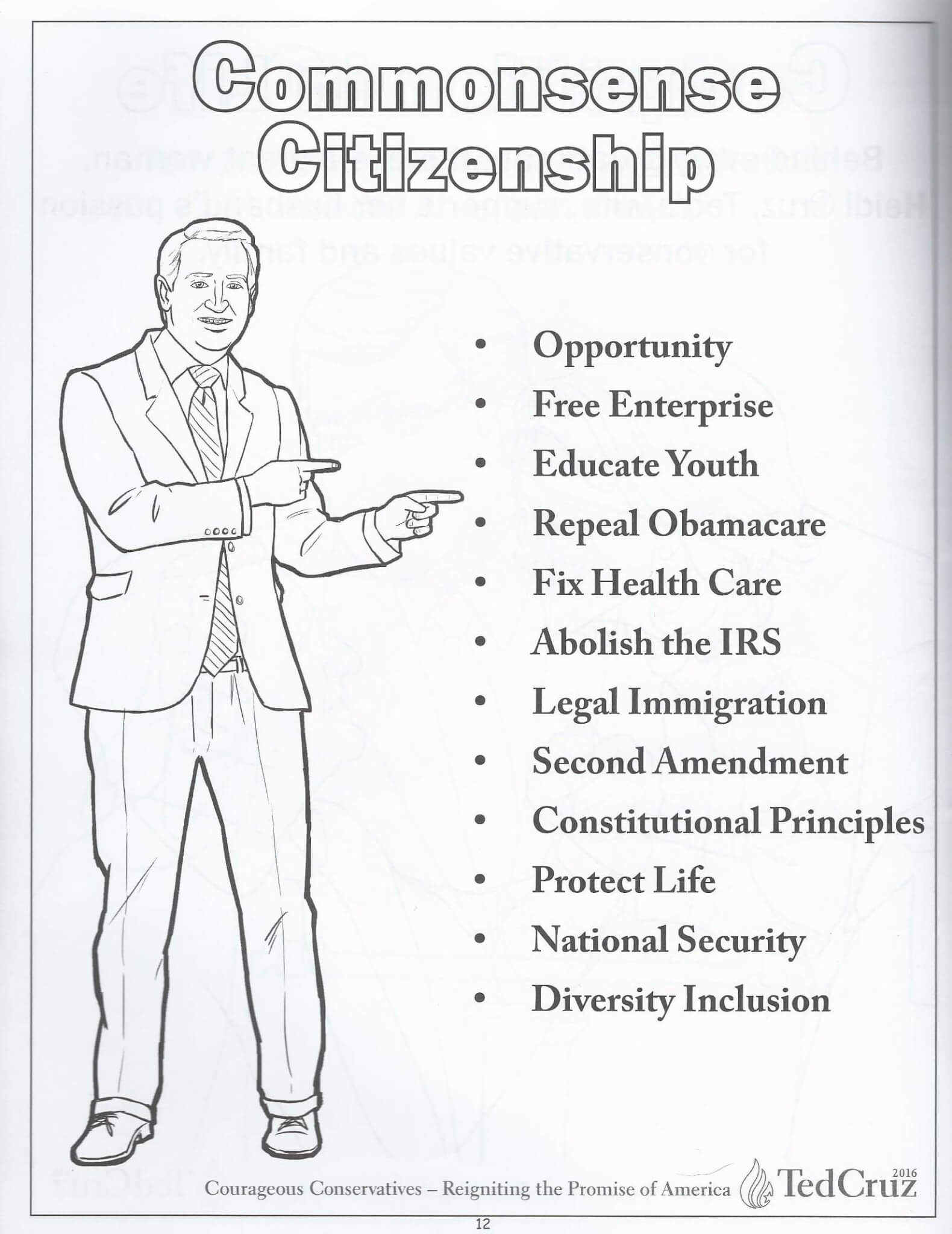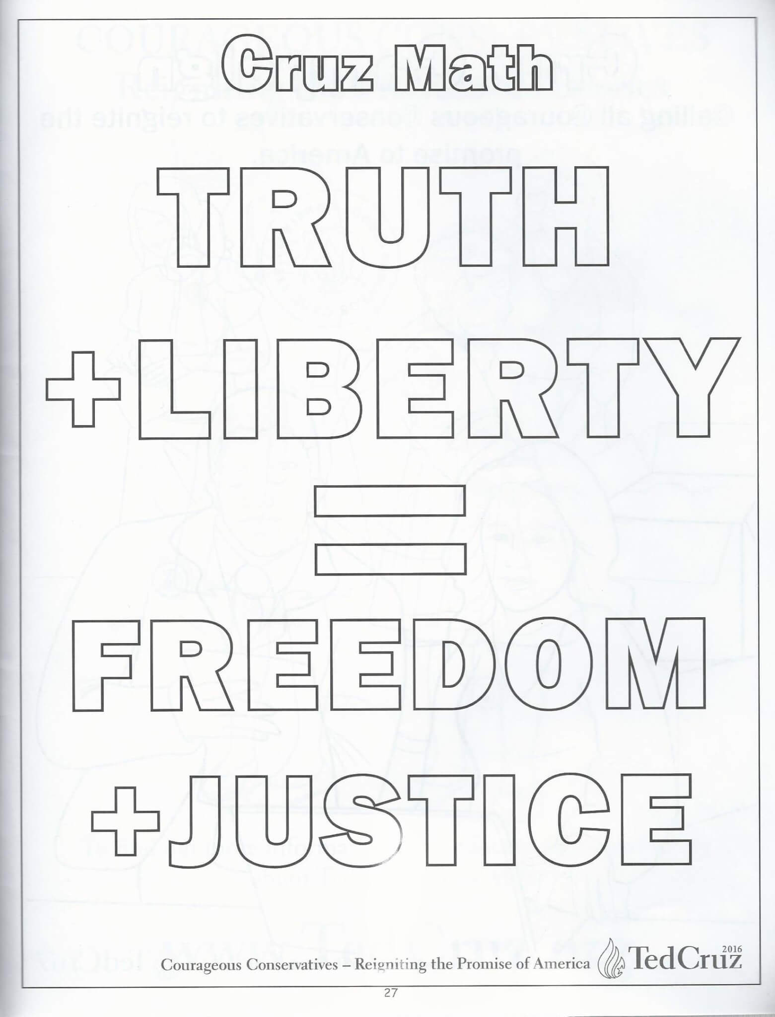 But the coloring book itself? Boy, it’s something else. 30 pages in length and produced by a professional children’s coloring book company, one can only imagine how much money they spent on this. The pictures themselves are, uh, pretty interesting. So let’s take a look at some of the best pages in the Cruz campaign’s coloring book and have some fun adding a little commentary of our own to the illustrations.