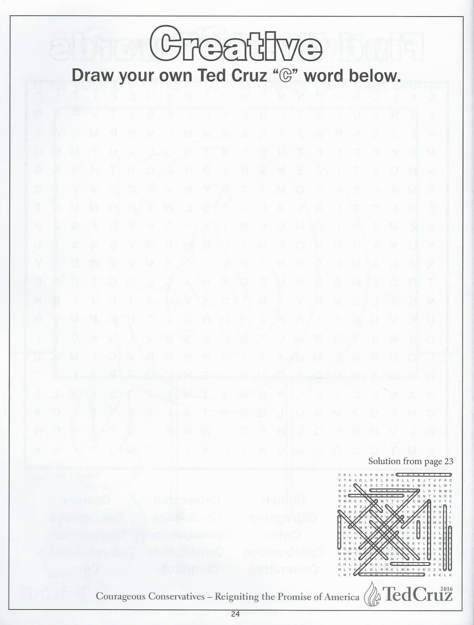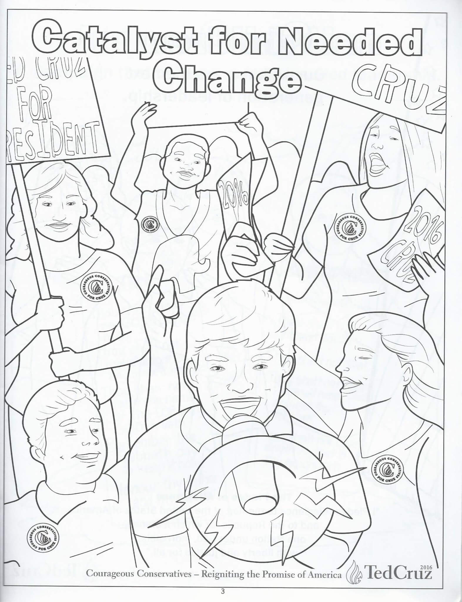 Few other presidential candidates’ campaign events are as stage-managed as Ted Cruz’s. Fancy backdrops, dozens of volunteers in matching t-shirts to welcome you, well-produced introductory videos and free pocket constitutions are present at nearly every Cruz event in Iowa. And the best piece of campaign chum you’ll find when you go see Cruz in person? The professional children’s coloring book produced by his campaign.