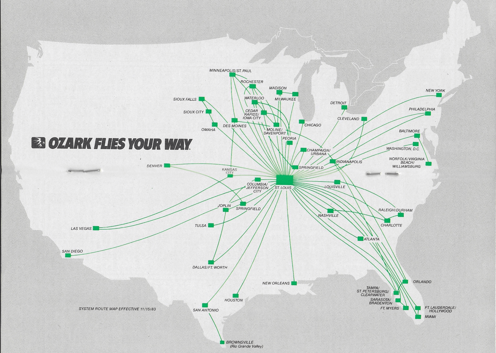 During the regulated era, Ozark Airlines, based in St. Louis, provided local service for many small and large Iowa communities (Ozark was eventually acquired by TWA in 1986). There were other local service airlines, such as North Central and Mid-Continent, but Ozark was the more dominant local service airline in this part of the Midwest.