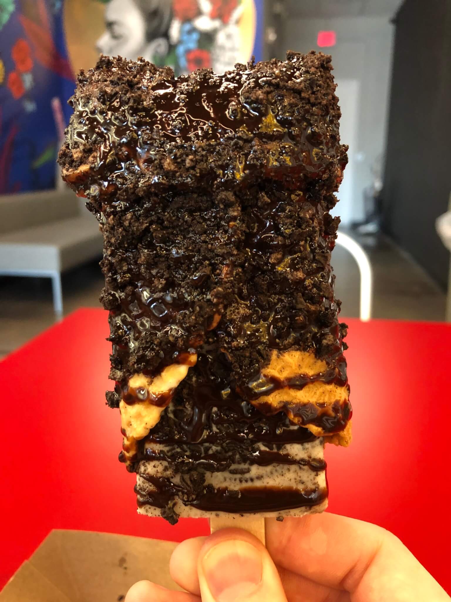 What Sean Got: Oreo paleta covered by a waffle cone smothered in chocolate with an Oreo topping.