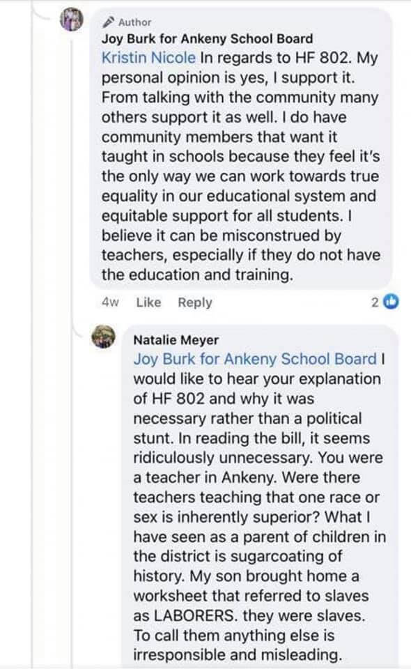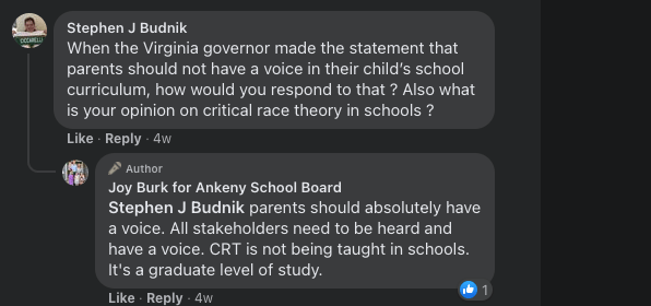 Barthole and Burk were also asked their views on CRT in a private Ankeny parenting Facebook group. Barthole noted it was important to follow Iowa law and teach kids how to think and not what to think. Burk said she understands it’s a hot-button issue, but needed to learn more about it before answering a question. Later in public responses, Burk noted CRT is not being taught in schools while reaffirming her support for parental involvement in curriculum and Iowa’s divisive concept law.