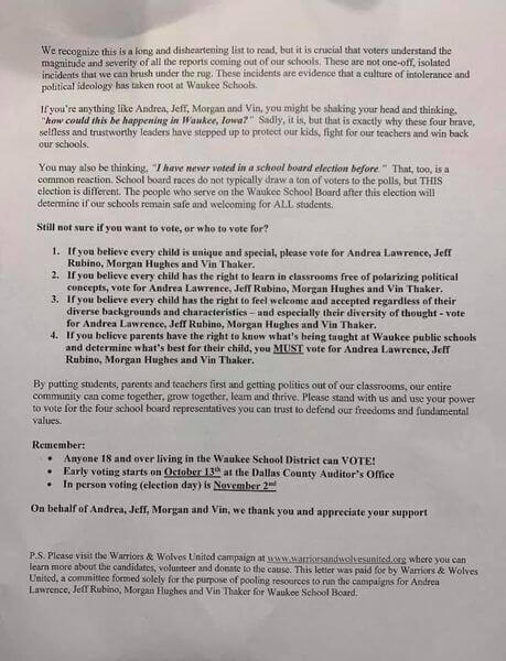 The Waukee candidates may also have gone overboard in how they campaigned on the issue. Under their Warriors and Wolves banner, the candidates and their supporters distributed a two-page flier that made direct attacks against teachers and district personnel. It did not include citations (their website had some instead), and critics pointed out that many of them were essentially rumors from anonymous sources or significant misrepresentations of what really happened in the schools.