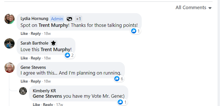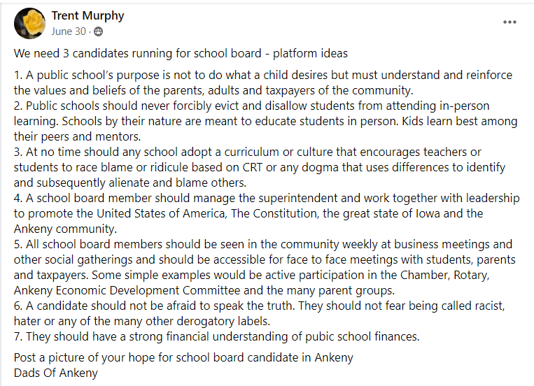 Before he became a candidate, Murphy posted his longing for three anti-CRT candidates who supported keeping kids in school and weren’t afraid of being called a racist. He made these remarks in a June post inside a private Ankeny parents’ Facebook group, to which Barthole commented “Love this Trent Murphy!”