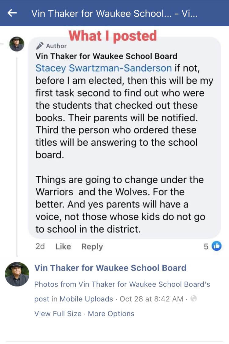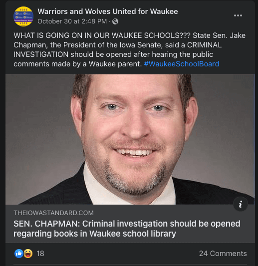 In the late stages of the campaign, the Warriors and Wolves United Facebook page shared article links that supported opening a criminal investigation related to some LGTBQ books being in the high school library.