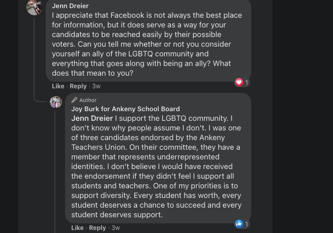 Burk, on her campaign page, noted she did not think she would have been endorsed by Ankeny’s Iowa State Education Association chapter if she didn’t support the LGTBQ community.