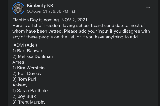 Burk, Murphy, and Barthole made it clear they were against mask mandates, a popular topic in the private Ankeny parent Facebook pages. All three were personally endorsed by Kimberly Reicks, an Ankeny mother who, alongside Emily Peterson of Ankeny, are known as the Iowa Mama Bears in far-right circles because of their opposition to vaccines and mandates.