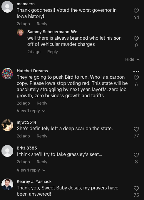So what do I think? I think the most dangerous thing Iowa could do right now is sigh with relief and go quiet. Because the political machine that kept Reynolds in power for so long? It’s still oiled, loud, and ready to install the next hand-picked heir to the ideology. If we don’t organize, speak up, and vote, we’re going to wake up in 2027 with Reynolds 2.0—this time with better PR and fewer apologies.