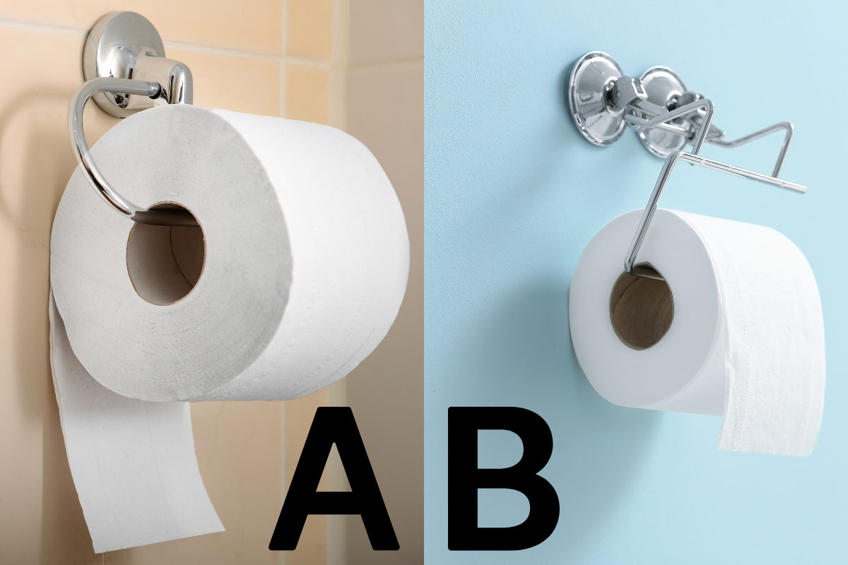 - “B unless you have small children or cats that ‘bat’ at the toilet paper. If you hang it the ‘A’ (under) way they can bat away and the tp stays put. If you hang it the ‘B’ way you have tp all over the place.” ~Janette B.