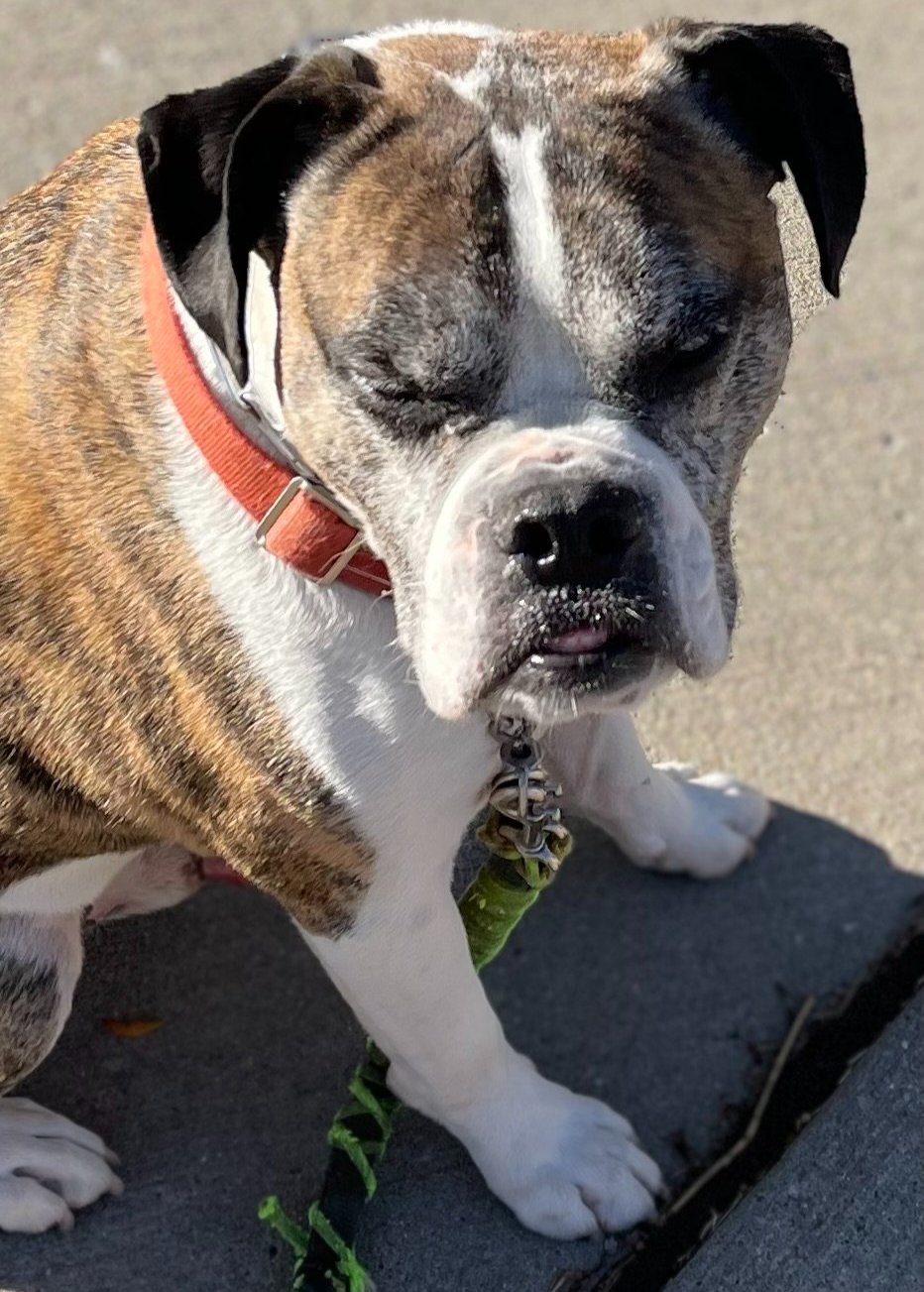 This guy with the sun in his eyes, according to reader Douglas N., is “Foster Dog Rex, age 8, (an) English/American bulldog cross. He sleeps, he farts, he snores and slobbers.” The dream!