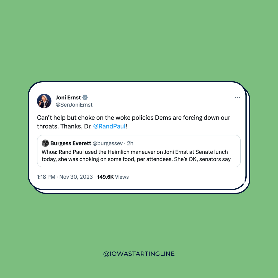 US Sen. Joni Ernst from Iowa had this totally normal response to a fellow senator saving her life during a Senate GOP lunch on Thursday.