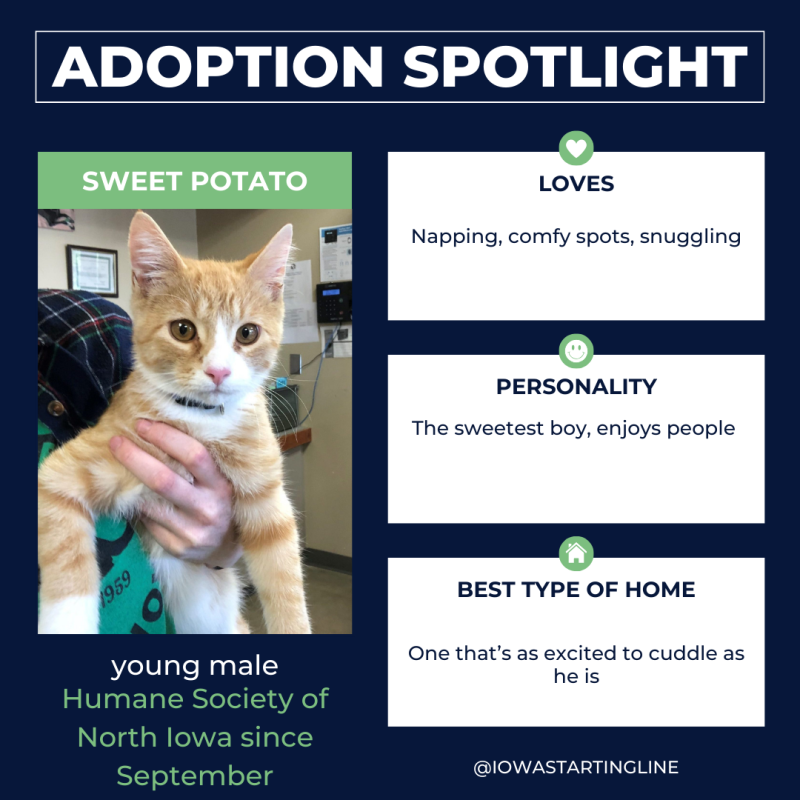 Sweet Potato lives up to his name as he’s both sweet and often found sleeping (on his back in his kennel). He’d love a new family with comfortable spots to relax in, especially if they involve cuddling. Check him out here.