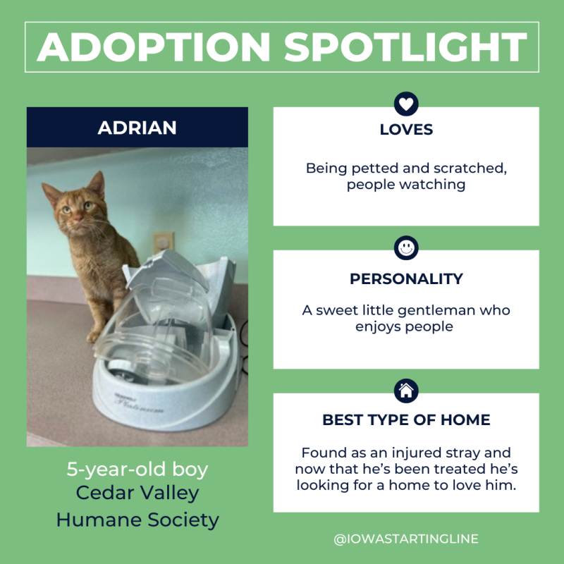 Adrian came to the shelter as an injured stray and now that he’s recovered, he’s ready to find his new family. At the shelter, he enjoys people watching and when people come in to pet him. You can meet this sweet guy at the Cedar Valley Humane Society.