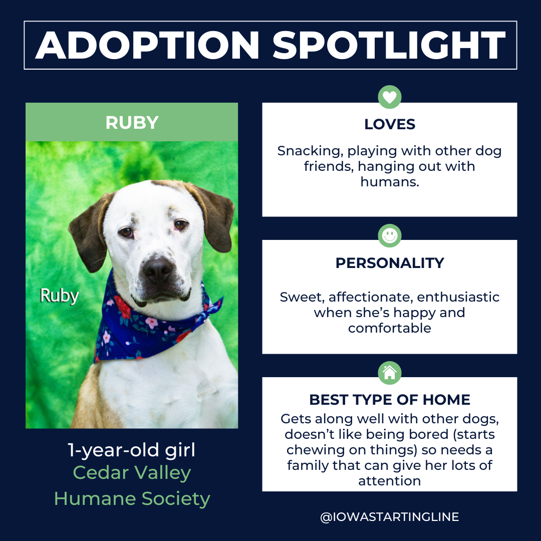 Ruby has done well with other dogs at the shelter, but she’d also be okay as the only dog in the houseโshe loves playing regardless. What she really needs is a family that won’t leave her alone for too long because she tends to chew on things when she gets bored. Other than that, all she needs is love and attention. You can find her at the Cedar Valley Humane Society.