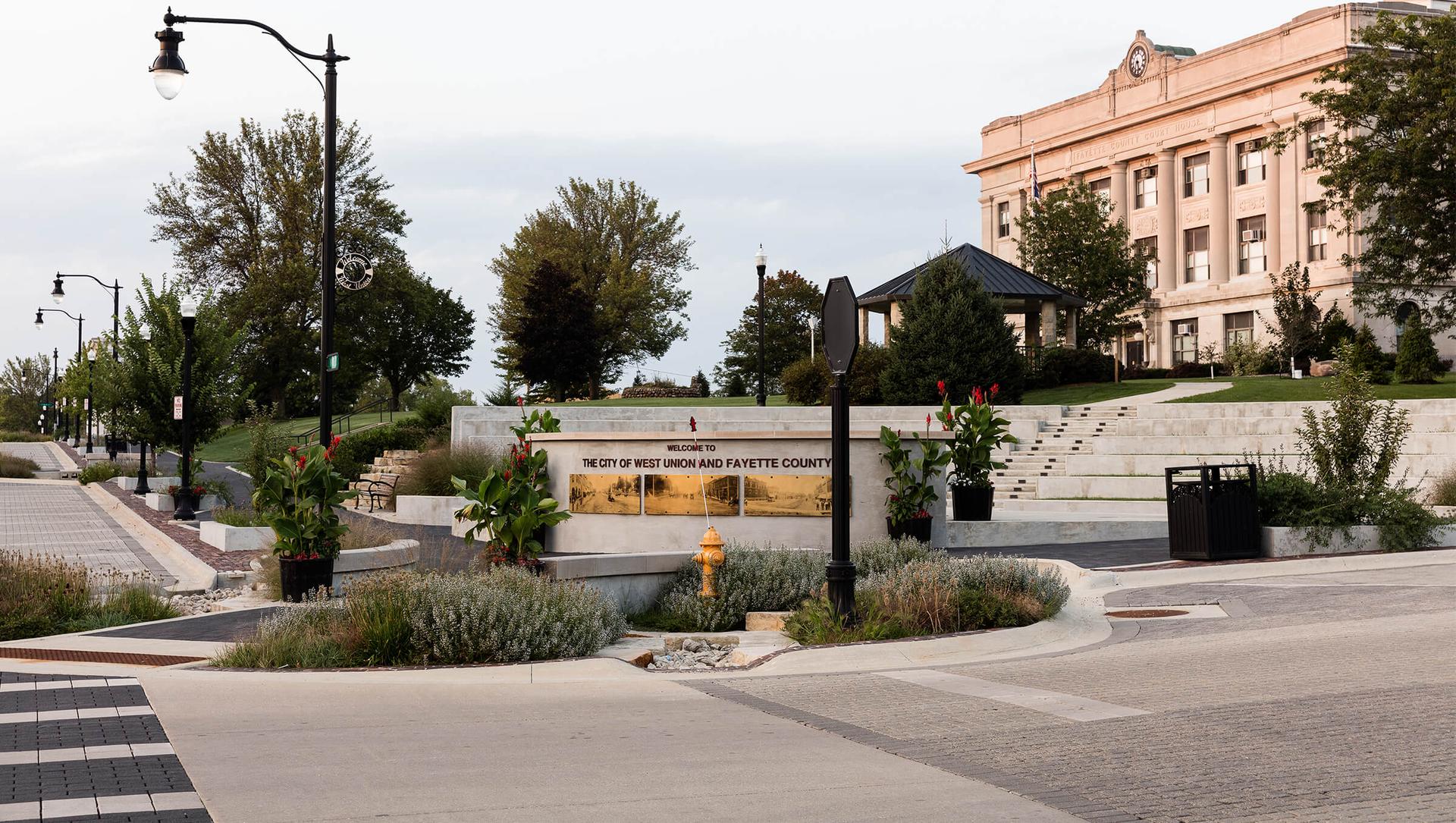 “The small town of West Union in Fayette County (pop. 2,490 in 2020) has an awesome town square! It’s seen many improvements in recent years, and is now used for many community events. Of course the center of attention is the courthouse, but the staging area is pretty cool too. If you ever get a chance to visit WU be sure to check it out!” — Judy D. (Judy included a photo, below)