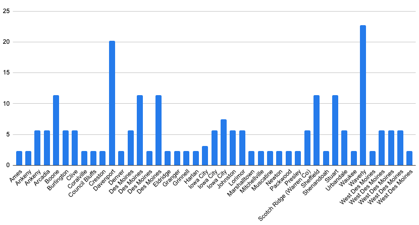 Our experiment, which we launched after publishing our report on the relationship between Iowa’s water quality and rising cancer rates, includes results from cities across the state. Interestingly, we had a cluster of tests from Central Iowa, where Water Works has had problems with nitrate contamination in recent years.