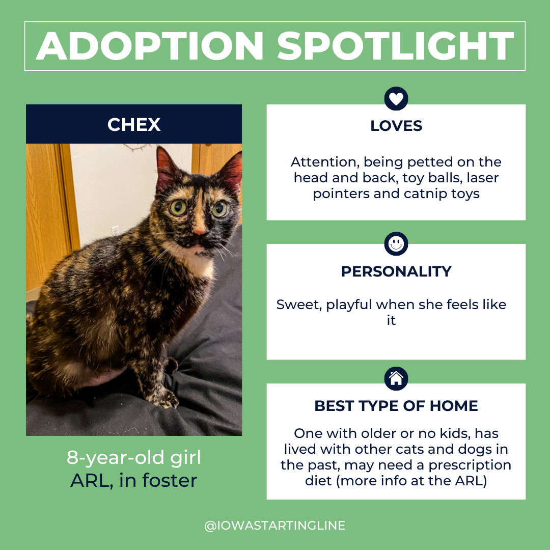 A snuggler (after running around with you) and an attention-seeking sweetheart are hoping to meet you. Check out Grace or Chex in Des Moines.