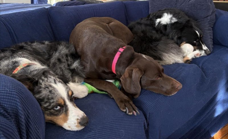 🐕 These sleepy pups are (left to right) Katara, Sadie, and Hugh, the dogs stealing all of reader Maegan B.‘s couch.