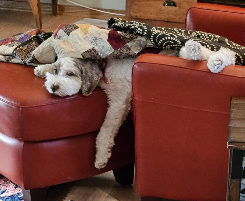 This is Murphy, who is “pretty flexible,” but also just fine under this quilt, thank you very much.