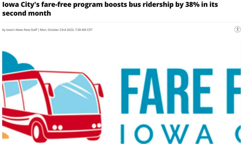 Iowa City is nearly three months into a two-year pilot program that began Aug. 1 to see how offering free transportation on city buses will impact residents and visitors. (Bus fees are around 8% of the city’s transportation revenue.)