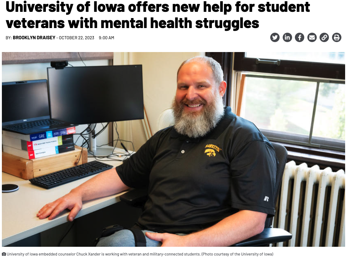 So the University of Iowa, with its 608 veteran and active-military students, hired Chuck Xander, a longtime mental health counselor and combat veteran, to help those students succeed.