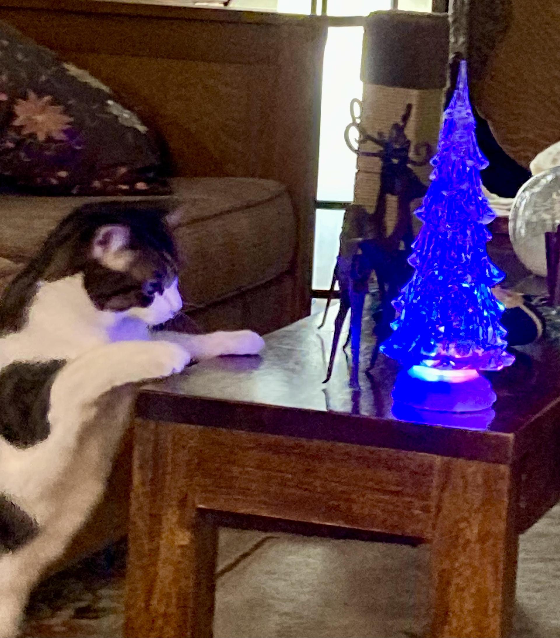This is Scooter. He’s not sure why his humans have this glowing, color-changing decoration they only put out sometimes, but he’s entranced.