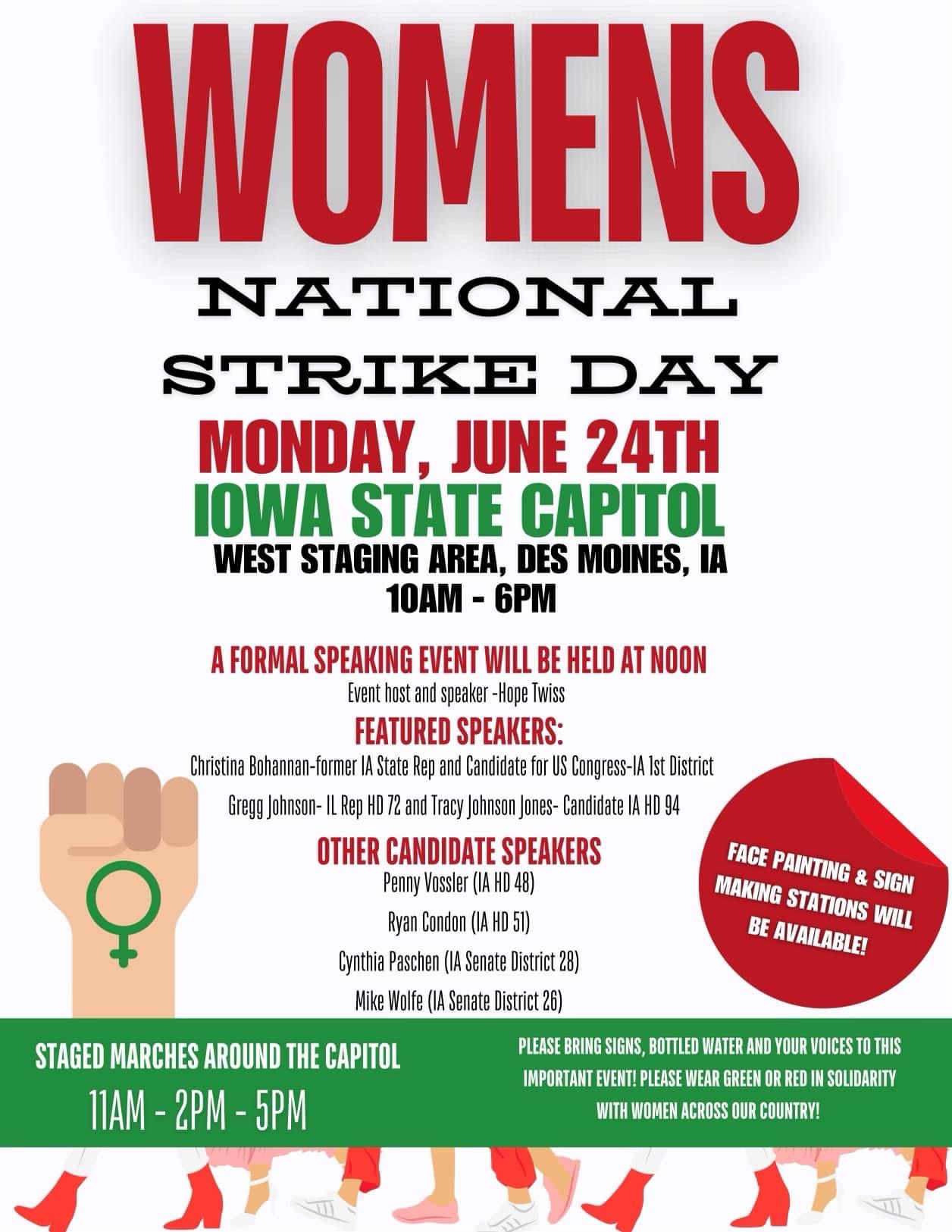 Iowa events for Women’s National Strike Day, the two-year anniversary of the overturning of Roe v. Wade, will be held Saturday and Monday.
