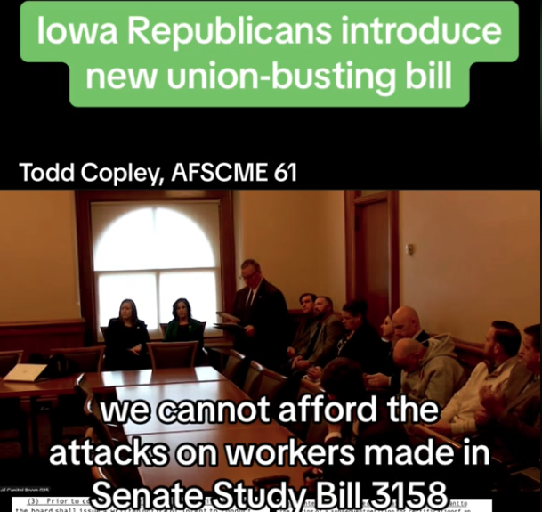 - “We are calling on everyone to take action,” said Iowa Federation of Labor President Charlie Wishman, asking Iowans to write their elected representatives (which you can do here).