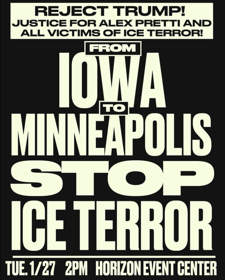 Pretti Good Reasons to Protest! ICE OUT OF EVERYWHERE! (protest outside of Trump’s speech): 2 p.m. Tuesday, Clive