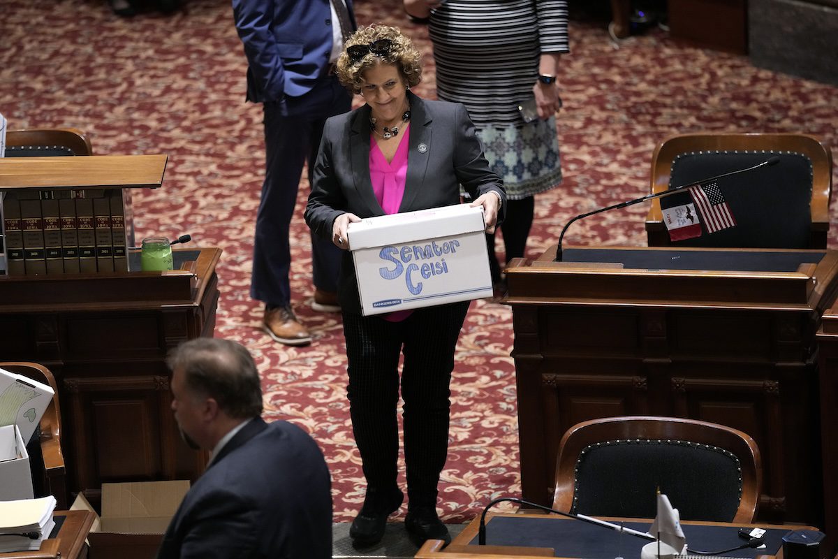 Sen. Claire Celsi, D-Polk, carries a box to her desk in the Iowa Senate, Thursday, May 4, 2023, at the Statehouse in Des Moines, Iowa. (AP Photo/Charlie Neibergall)
