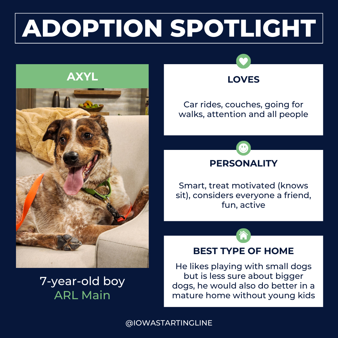 Axyl loves to ride in the car and make new friends. No one is a stranger to him, and he’d love to go on adventures with you. He gets along well with smaller dogs and he already knows how to sit on command. Give him a mature home without young kids and he’ll be happy.