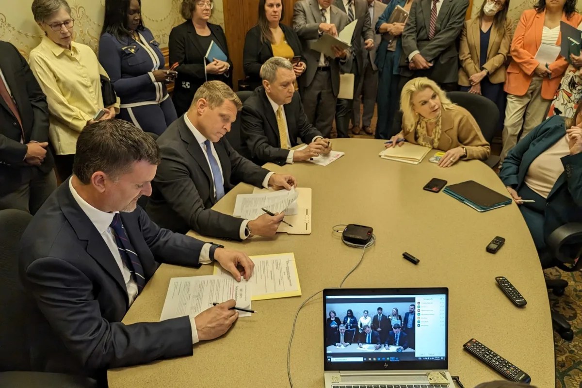 Iowa Sens. Scott Webster, Mike Bousselot, and Tony Bisignano take notes during an Iowa Senate subcommittee on banning basic income programs.