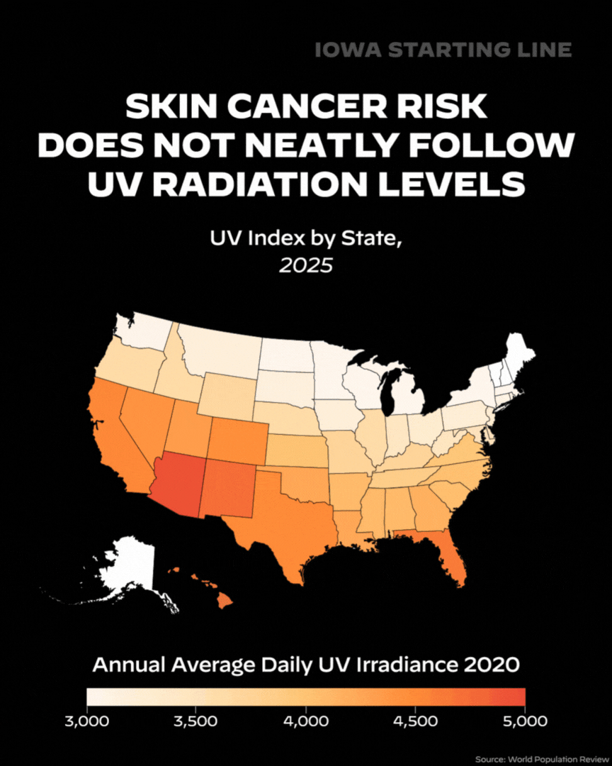 While Iowa outdoor workers face unavoidable UV exposure, a preventable danger comes from indoors: tanning beds. According to the American Academy of Dermatology, indoor tanning increases the chances of developing squamous cell carcinoma by 58% and basal cell carcinoma by 24%.
