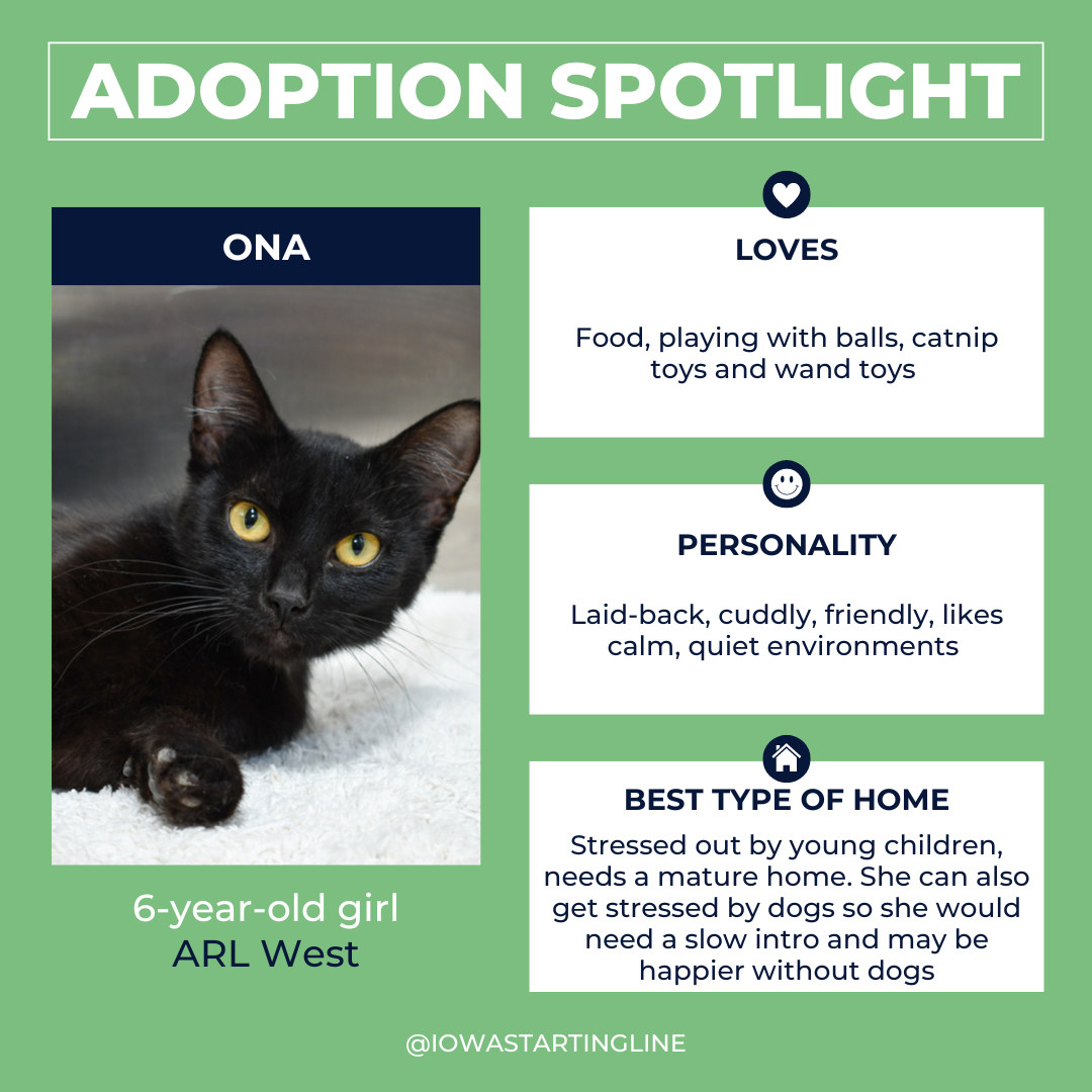 Ona is a cuddly kitty who is generally laid back, but dogs and small children can stress her out. She needs a mature home, and one without dogs (or with slow introductions). She might be shy at first, but she loves to be petted and to play with catnip toys, wand toys, and balls. You can meet her at ARL West.