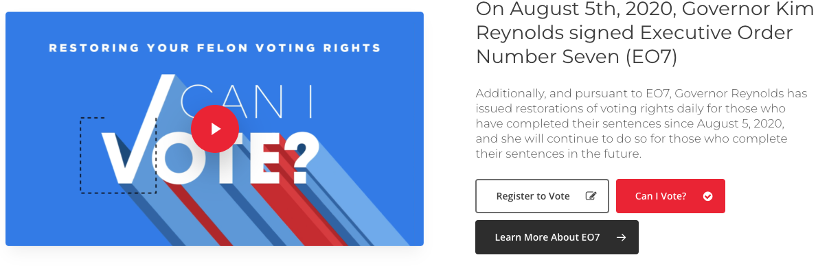 In Iowa, your right to vote is taken away if you have been convicted of a felony. But in 2020, the governor signed an executive order restoring the right to vote for individuals charged with most felony crimes, once they’ve completed their sentence, including probation. In some cases, individuals may have to apply to have their voting rights restored.