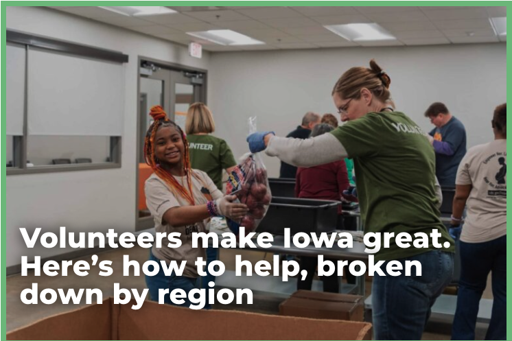 In Iowa, there are a wide variety of volunteer opportunities throughout the state at local food banks, state parks, libraries, hospitals, and more.