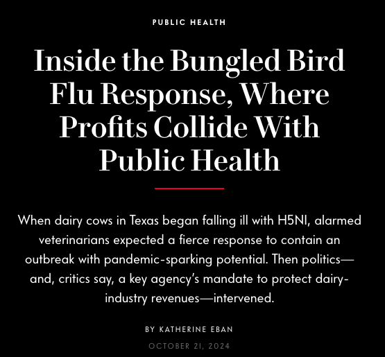 The bird flu variant that has spread to over 300 dairy cattle herds in 14 states, infecting at least 26 farm workers, “should be a story of heroism, cooperation, and an all-hands effort to defeat a wily virus that many scientists warn could mutate into a pandemic threat,” says a new article in Vanity Fair.