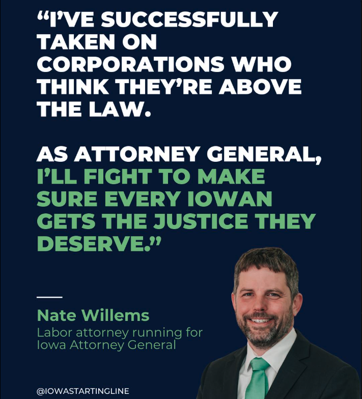 Labor attorney runs for Iowa Attorney General: Nate Willems, a labor attorney from Mount Vernon, announced this week he would be running for Attorney General as a Democrat, and promptly raised more than $130,000 in the first 24 hours after the announcement. The seat is currently held by Republican Brenna Bird, but Willems may not face her; Bird is rumored to be eyeing the governor’s mansion in 2026.