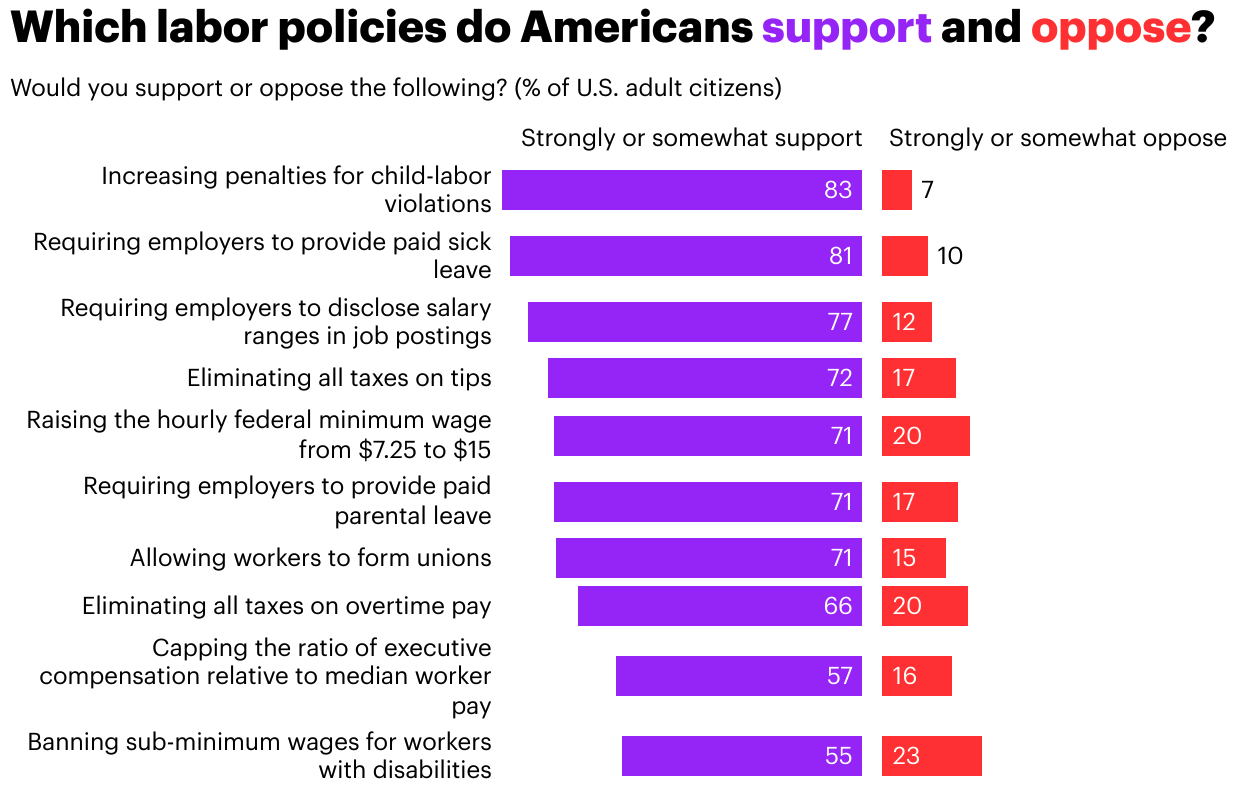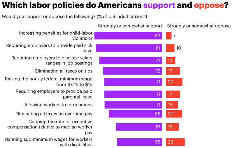 - A new May Day poll shows Americans like pro-worker policies, including requiring businesses to provide paid sick leave and parental leave, raising the minimum wage, and putting a cap on how much a CEO can make. (YouGov)