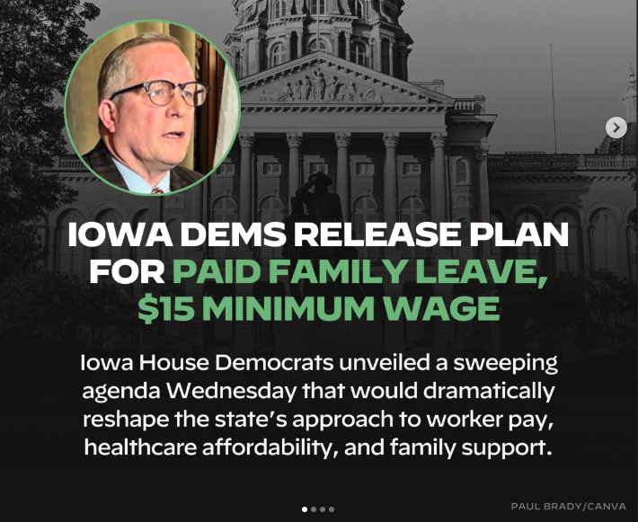 $15 minimum wage on the table: Iowa House Democrats unveiled a sweeping agenda last week that includes raising Iowa’s minimum wage to $15 per hour, establishing mandatory paid family leave, freezing utility rates through 2030, and eliminating the state’s Education Savings Account program to fund health insurance subsidies. Read the details here.