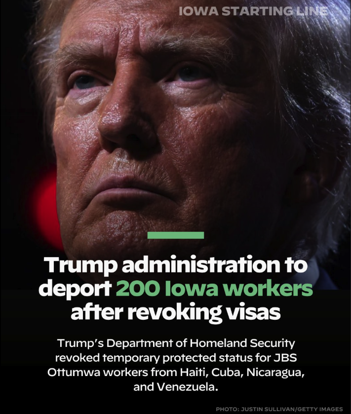 Gutting Iowa’s workforce: Pascual Pedro Pedro was a construction worker brought here as a child. Haitian refugees and others who were granted temporary legal status came here to fill meatpacking jobs. US Rep. Zach Nunn says President Donald Trump’s decisions to deport these Iowa workers are “right sizing.” Others openly wonder if it’s time to fight back. Iowa is already shedding people left and right because our laws are driving them away—contributing to Iowa being the fourth-highest state in the nation for outmigration of 20-somethings. (Iowa Capital Dispatch, IPR, Reddit, Cornhole Champions, Common Sense Institute)