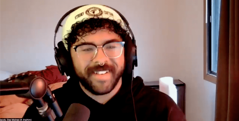 Jacob Scroggins, a shift supervisor at the Des Moines Starbucks and a strike captain at his store, appears in a screenshot from a video call with Iowa Starting Line’s Amie Rivers. (Amie Rivers/Iowa Starting Line)
