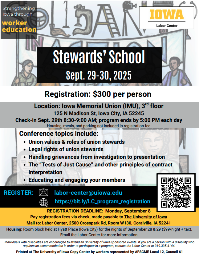 Labor Day in Iowa: Monday is Labor Day in the US, and the Iowa Federation of Labor has a listing of picnics and parades across Iowa here. But it’ll be more than that this year, as protests and rallies are planned simultaneously for the holiday, including from May Day Strong.